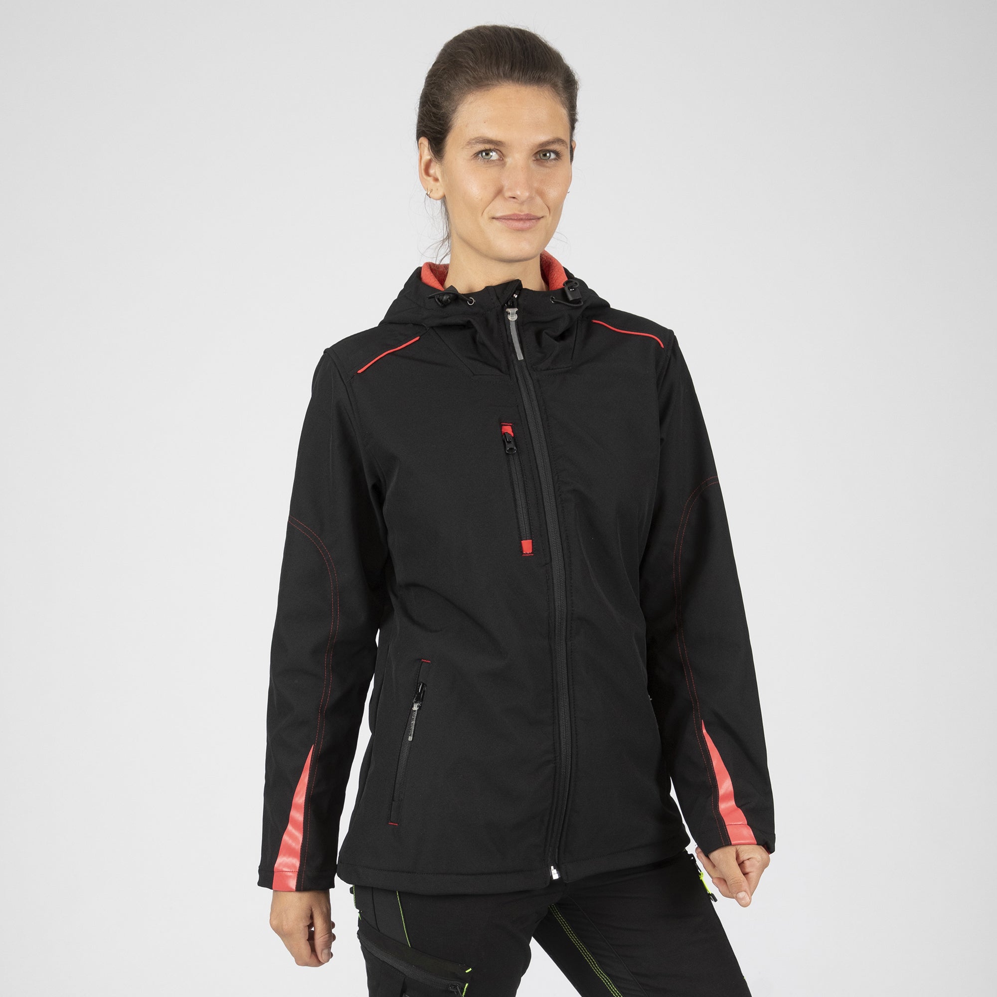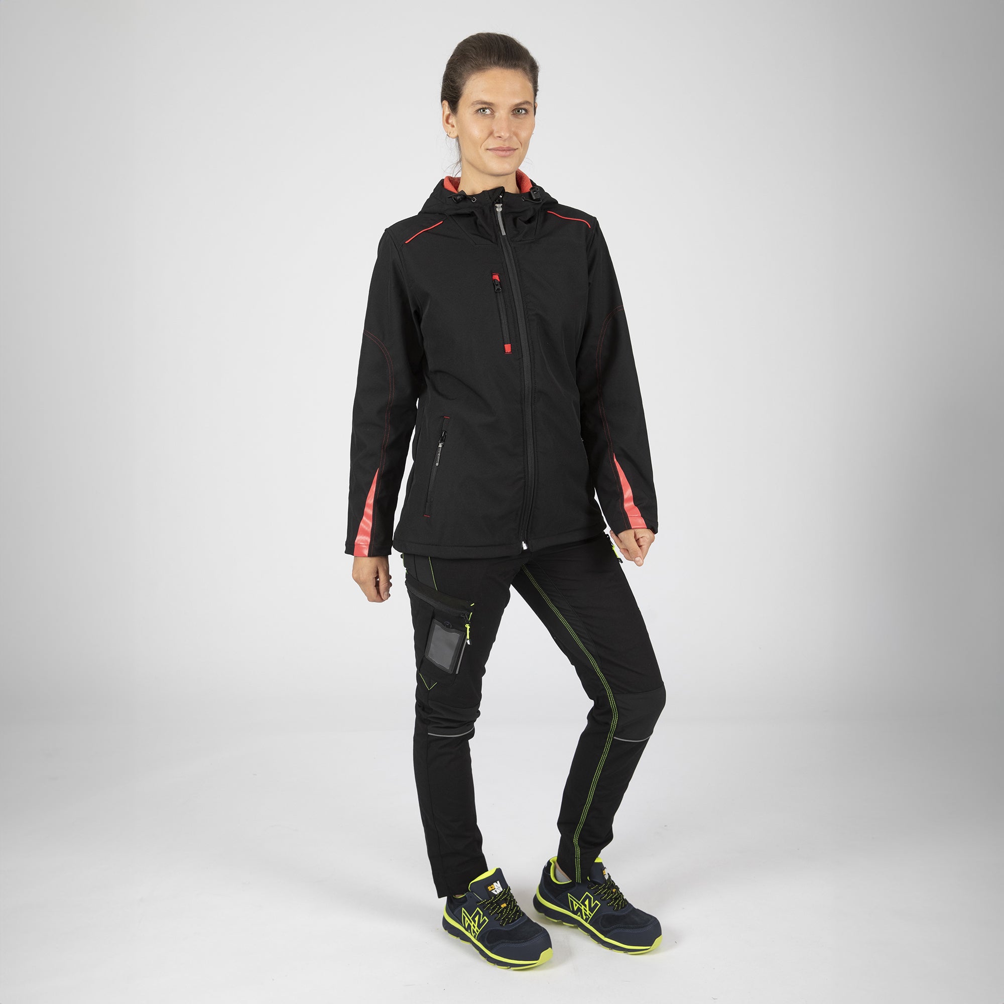 Découvrez le blouson de travail JUSTINE, une pièce élégante et pratique conçue pour vous protéger des intempéries. Cette veste à capuche en tissu SOFTSHELL de haute qualité offre non seulement une coupe féminine, mais aussi une protection efficace grâce à son tissu triple couche. Avec des détails fluo et des poches pratiques, dont une étanche, elle allie style moderne et fonctionnalité.
